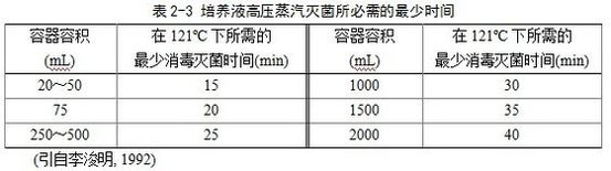 使用高壓蒸汽滅菌器滅菌時,將分裝好的培養液放入底部有一定量(淹沒加熱管)涼水的高壓蒸汽滅菌器內,增壓**0.35~0.4 kg/cm2時排凈滅菌器內冷空氣,以便使蒸汽能到達各個消毒部位,保證消毒滅菌徹底。然后繼續加壓加熱,當壓力表讀數達到1.0~1.1 kg/cm2為121 ºC,保持15~20 min即可。由于消毒滅菌效果取決于溫度而不是壓力,所以在一定壓力下保持較長的消毒滅菌時間是必須的。在121 ºC的蒸汽溫度下可以很快殺死各種細菌及高度耐熱的芽孢桿菌,因此許多培養液的消毒滅菌壓力、溫度一般保持在1.0~1.1 kg/cm2、121 ºC。消毒滅菌時間與需要消毒滅菌的培養液量密切相關(表2-3),時間不足達不到滅菌效果,時間過長培養液內的一些化學物質遭到破壞,影響培養液成分。消毒滅菌結束后,關閉熱源,只有當滅菌器內壓力降為零時才能打開放氣閥,排除剩余蒸汽,取出培養液。不可在壓力較高時打開放氣閥,引起減壓沸騰,使容器中液體溢出。培養液組成中如含有遇熱易分解的物質,則需用過濾方法消毒滅菌。shou先對培養液中耐熱組分進行高壓蒸汽滅菌后放置在無菌場所,固體培養液在40 ºC左右瓊脂即將凝結前,加入經過過濾除菌的不耐熱溶液,混勻后冷卻備用。液體培養液在冷卻到室溫后再加入過濾除菌溶液。過濾除菌時,使用孔徑為0.22~0.45 μm或更小的細菌濾膜。過濾除菌可利用抽濾裝置或注射過濾器進行,所用器皿均應進行高壓消毒滅菌,溫度不應超過121 ºC。
