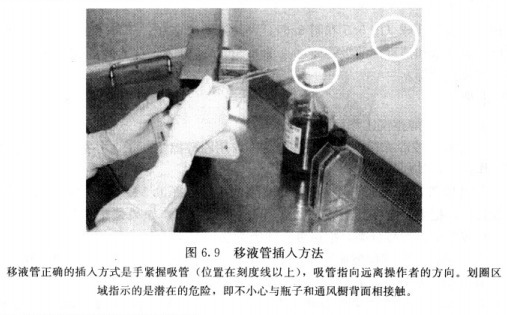 (a)如果是玻璃吸管,從盒中取出吸管時.要保持待取吸管在盒中與其他吸管平行,并盡叮能少地接觸他們,特別是吸管頭部,如果拿著的吸管接觸了其他仍在盒內的吸管尾端.則不能再使用它;把吸管插人移液器中,吸竹指向你的外側,握在刻度上面部分,這樣,吸管進人試劑瓶或培養(yǎng)瓶的部分將不會被污染(圖6.9).