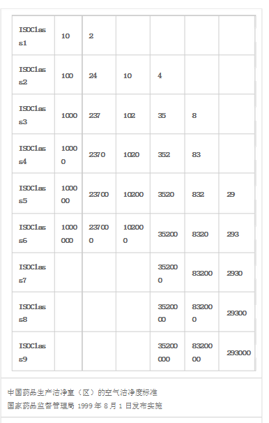潔凈室檢測應參考的潔凈等級: 空氣潔凈度等級參考: