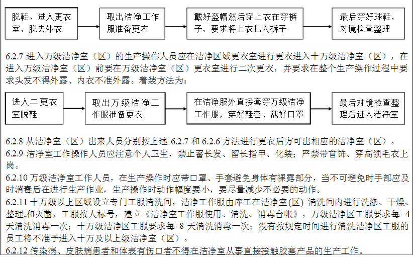 6.2.6進入十萬級潔凈室(區(qū))的生產操作人員應在潔凈區(qū)域更衣室進行更衣,要求穿著防靜電無紡布工作服、白色球鞋,在整個生產操作過程中要求頭發(fā)不得外露、內衣不準外露。著裝方法為: