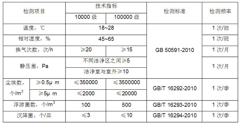 1.1  為了保證潔凈度滿足工藝需求,必須對潔凈室內潔凈度進行檢測。 1.2  生產管理員負責每班次上下午監控記錄潔凈室溫濕度和靜壓差,并記錄。 1.3  檢測周期:檢測頻率見下表: